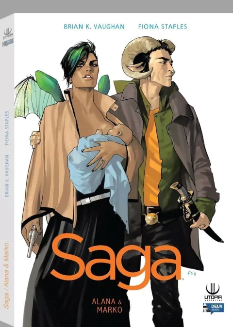 "En Saga seguimos la historia de Alana y Marko, una pareja que encuentra el amor entre el caos de la guerra y forma una familia con el nacimiento de su hija. Su objetivo: dejar todo atrás, arriesgando todo lo que tienen en su vida para traer una nueva a este peligroso y antiguo universo. Así empieza una de las odiseas más memorables del noveno arte.